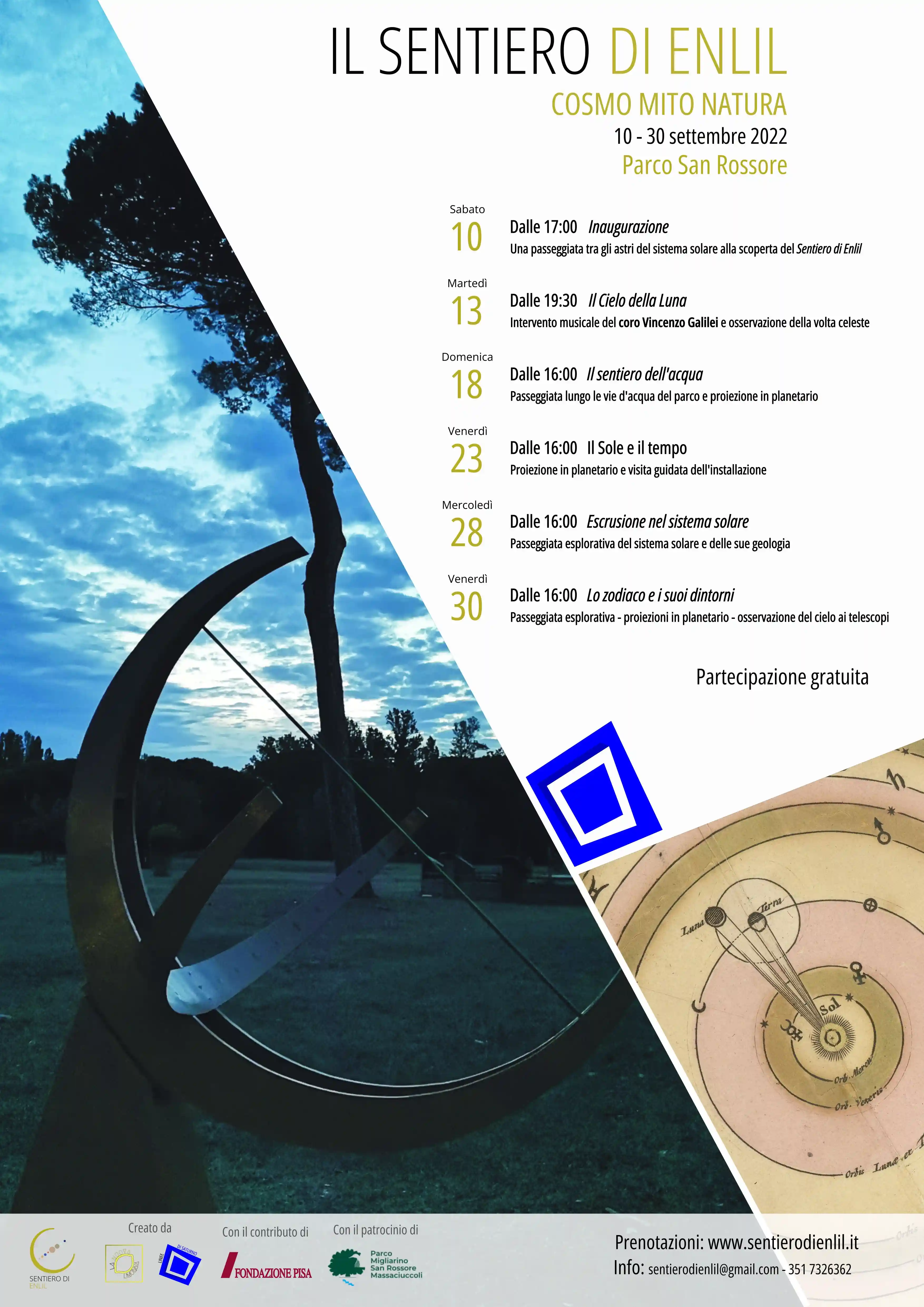 Nel periodo di apertura del Sentiero di Enlil il percorso sarà visitabile liberamente lungo i sentieri del parco, con pannelli e indicazioni che guidano i visitatori tra le diverse “stazioni” del Sistema Solare. A questo si aggiunge una serie di incontri tematici.
